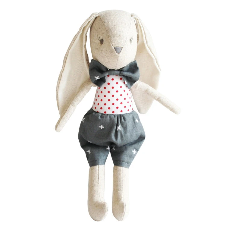 This is a beautiful Baby version of Alimrose Design’s sweet Linen Louie Bunny Rabbit. Measuring 26cm from top to bottom, Baby Louie is made from untreated pure cotton fabric that has a very natural look and feel. His dark grey shorts match his dapper bow tie and both are nicely set off by a sweet red polkadot bodice.