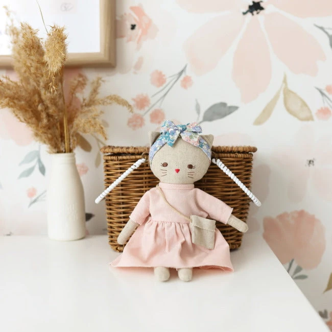 Sweet little Mini Lilly the Kitty Cat from Alimrose Designs is dressed in a the softest pink linen dress. She’s jazzed up her outfit with a cool cross-body bag and a pretty floral print headband with bow.