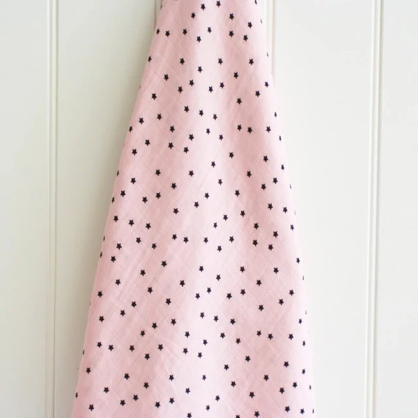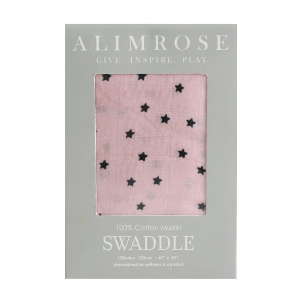 The Alimrose Starry Night Pink Muslin Swaddle is lovely and generous at 120cm square and features a super soft pink base scattered with little black stars.