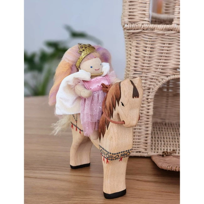 Our handpainted Bumbu Toys Wooden Horse Steed is incredibly detailed and beautiful. Its natural light timber body has been painted with a brown mane, black hooves, and deep blue-grey and red decorative markings. The Bumbu Steed features a blond brush tail and a leather rope bridle through its mouth.