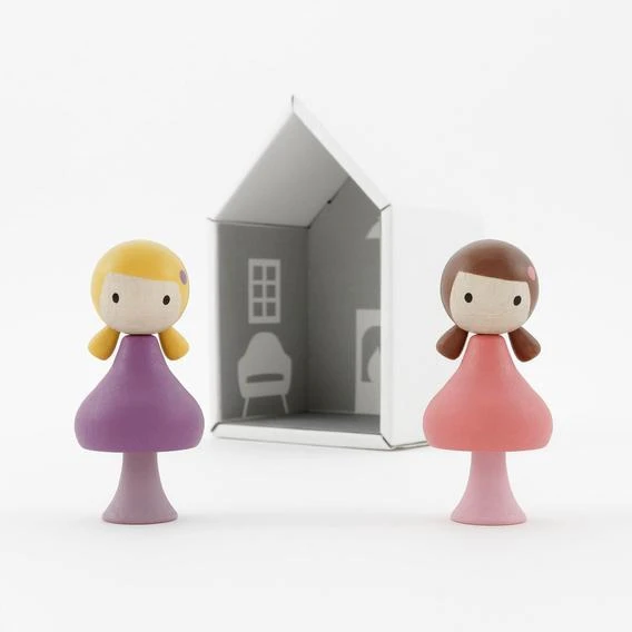 Lucy and Maggie are a blonde and brunette pair of CLiCQUES girls, with handpainted purple and pink dresses, legs, and hairbows. Their facial features are deliberately kept minimal to keep these beautiful wooden toys open-ended and ready for your child’s imagination.