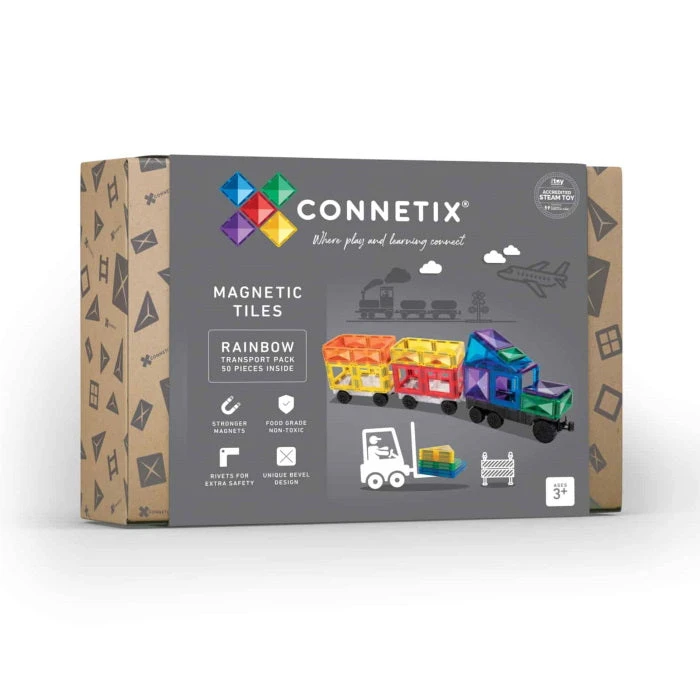 The Connetix 50 Piece Rainbow Transport Pack will appeal to vehicle lovers both young and old. It contains a large grey truck base with wheels, two clear car bases with wheels, and lots of squares, doors, triangles, and rectangles to help your child create their very own truck/van/car/train/bus combinations. The three vehicle bases all have genuine rubber wheels – try zooming them over some of our Waytoplay roads or the arc of a Wobbel Board. The pieces are all compatible with our other Connetix packs.