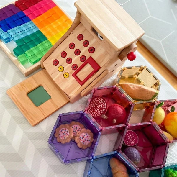 Add this to your child’s pretend shop or marketplace and introduce them to numbers and counting, along with customer service and social skills. The cash register does not calculate or do any sums as the push buttons are pretend only; it is all left to your child’s imagination.