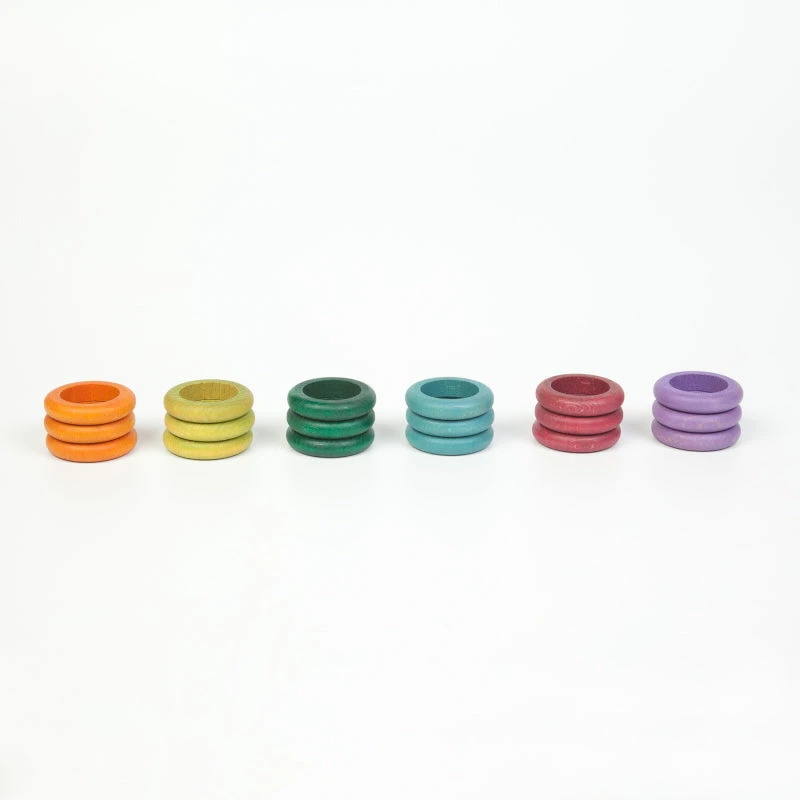 The beautiful Grapat 18 Rings in Warm Colours set is simply wonderful for loose parts play, particularly when combined with Nins and Coins. Use them for colour matching, sorting, counting, and more.