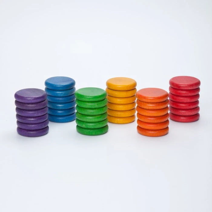 Encourage the early development of logical thinking and mathematical skills through play with the beautiful Grapat 36 Coins in 6 Colours. This set is perfect for counting games, stacking, sorting, posting colour matching, and imaginative shop and pocket money games.
