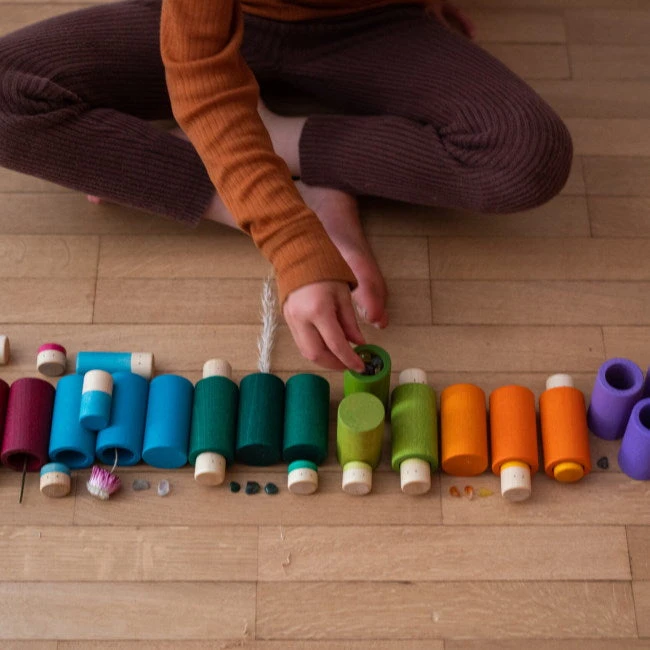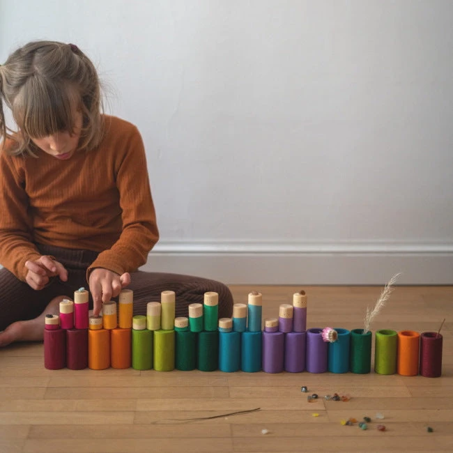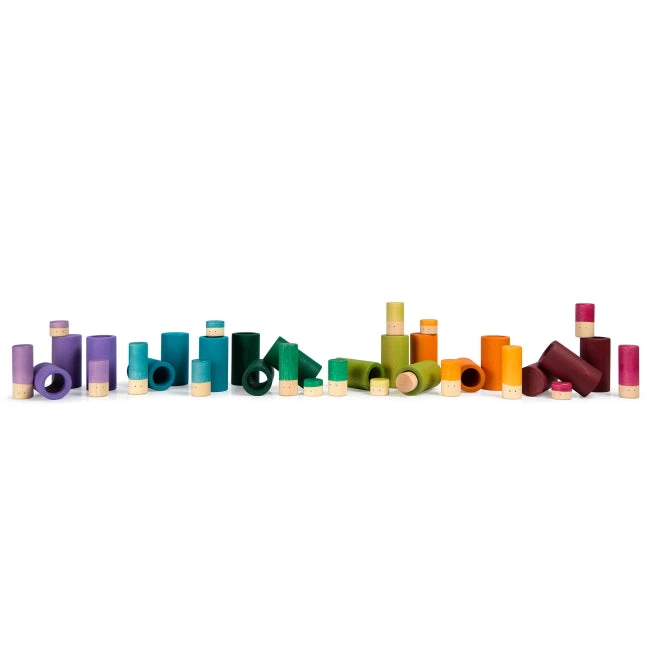Encourage your child’s creative skills and imagination with the gorgeous Grapat La set of 36 jewel-toned loose part wooden toys. By popular demand, Grapat has split the incredible Lola set in half, creating this Grapat La set and the equally beautiful rainbow coloured Grapat Lo set. Your child will have so much fun hiding the little Lola people or bugs in the empty tubes, stacking them on top of each other and the full columns, and threading the empty tubes onto string.