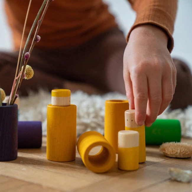 Encourage your child’s creative skills and imagination with the gorgeous Grapat Lo set of 36 rainbow-coloured loose part wooden toys. By popular demand, Grapat has split the incredible Lola set in half, creating this Grapat Lo set and the equally beautiful Grapat La set. Your child will have so much fun hiding the little Lola people or bugs in the empty tubes, stacking them on top of each other and the full columns, and threading the empty tubes onto string.