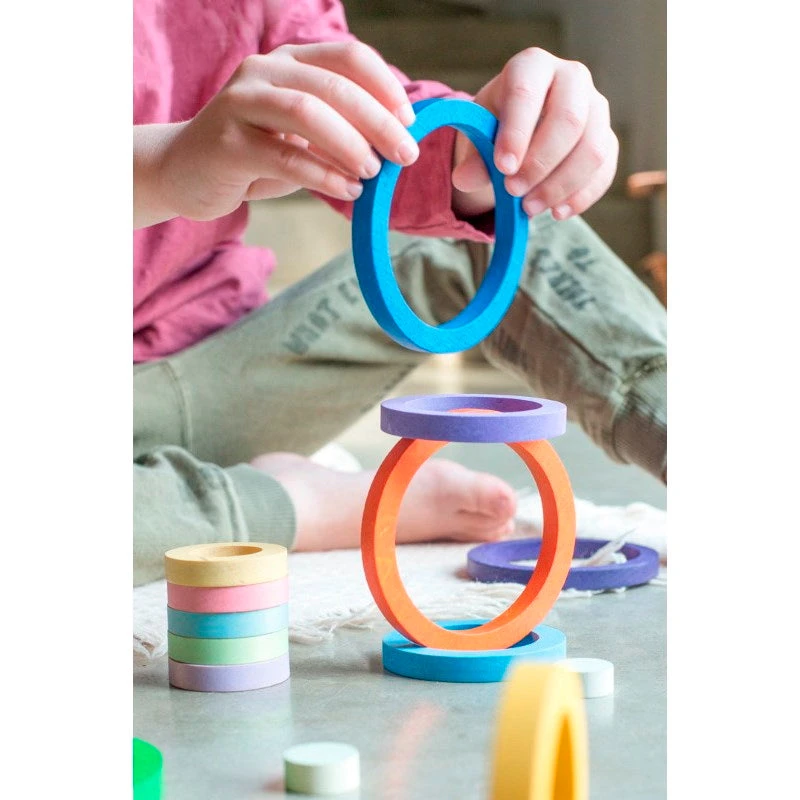 The set includes 24 concentric nesting rings. The rings come in six colours, for each of which there are four shades, from the beautiful bright Grapat signature rainbow colours right down to the gentlest of faded pastels. The rings also come in four different sizes that nest perfectly into each other.