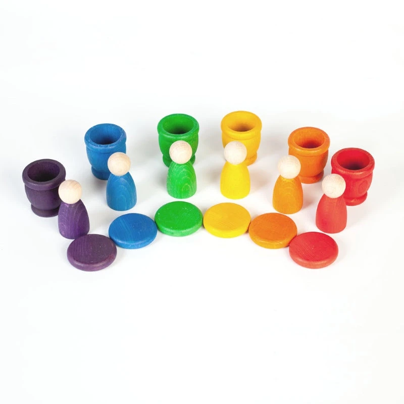 Made from natural timber with water-based colour stain, the Nins, Mates and Coins in Rainbow Colours feel beautiful in the hand and are fantastic for sensory play as well. Children can hide their Nin peg dolls in the little Mates cups and then add a matching or contrasting Coin as a lid.