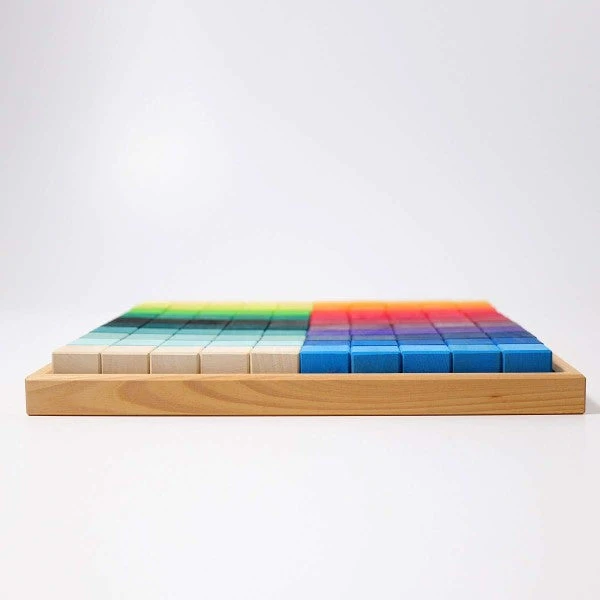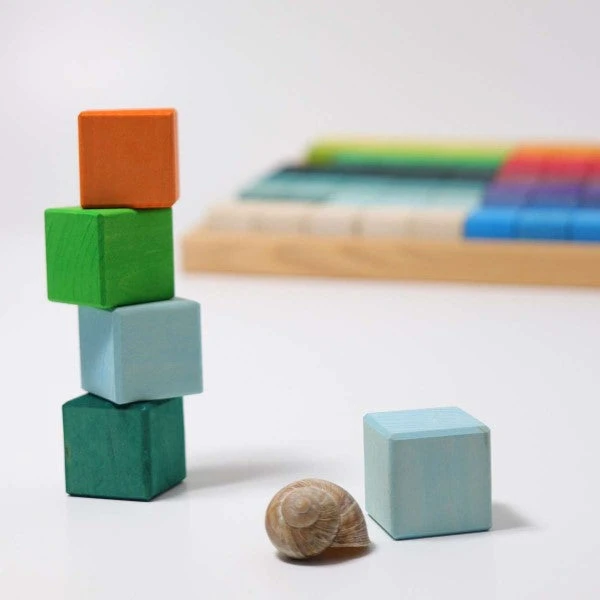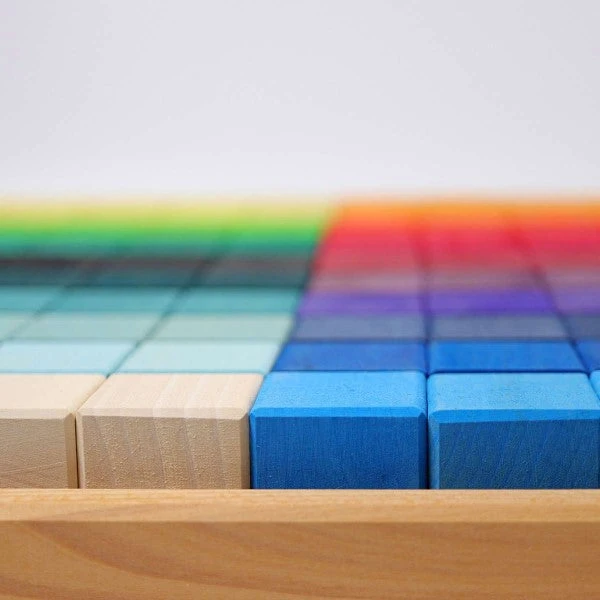 Oh the colours! The colour range in the Grimm’s Large Mosaic Square block set is delicious. The set includes 100 equally sized 4cm by 4cm by 4cm cubic blocks in a range of bright rainbow colours, pastels, and black and white. The colours are fantastic for sorting and counting games.