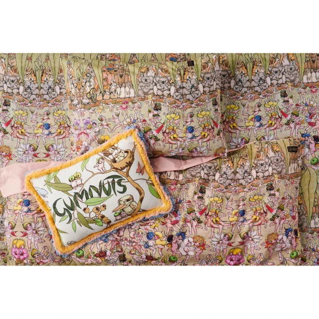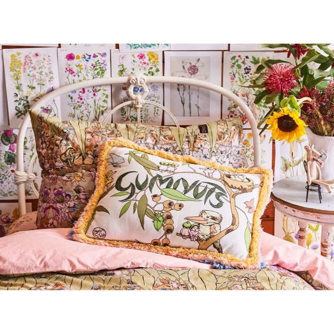 Kip and Co with May Gibbs have created an iconic bush babies scene up high amongst the branches, with the word Gumnuts picked out in gumleaves. Snugglepot and Cuddlepie are there, along with baby birds and Mrs Kookaburra. The rectangular cushion features a fringed edge in golden yellow and periwinkle blue.