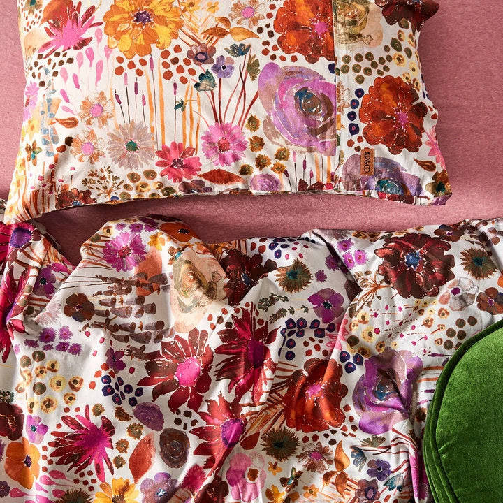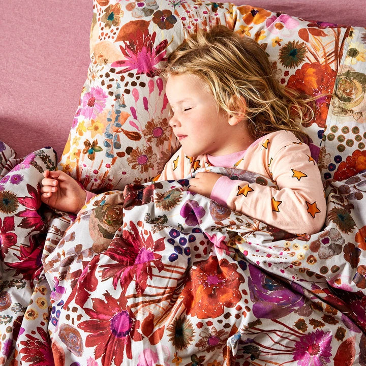 The most beautiful Pillow Case by clever Australian designers Kip and Co. The gorgeous Field of Dreams print has become one of the brand’s iconic designs. The mauve colourway features blooms in purples and pinks on a gorgeous soft silver grey background. Pops of orange, terracotta, and navy blue finish off this beautiful print.