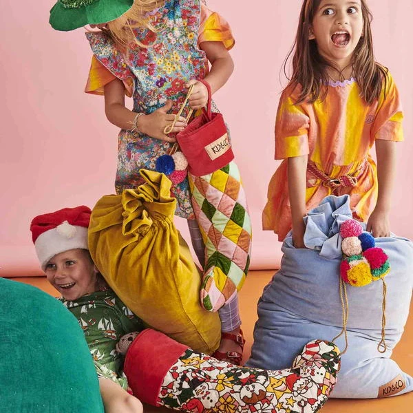 In 100% cotton velvet, a Kip and Co Velvet Santa Sack is a luxurious addition for under the Christmas tree. It features lovely fluffy multi-coloured sparkly pom-poms.