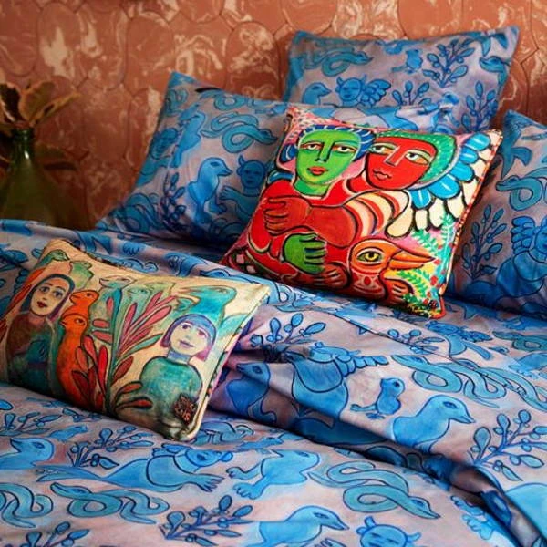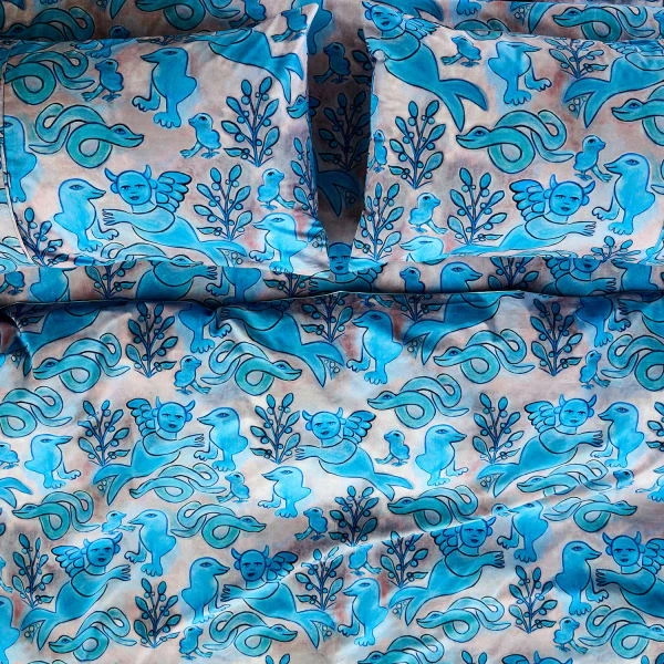 The incredible Kip and Co x Mirka collection is a celebration of beautiful art and one of Australia’s most beloved cultural icons, Mirka Mora. The vibrant Mermaid Dreaming Pillowcase features horned, winged mermaids, serpents, foliage, and birds in blue over a dusky lavender background.