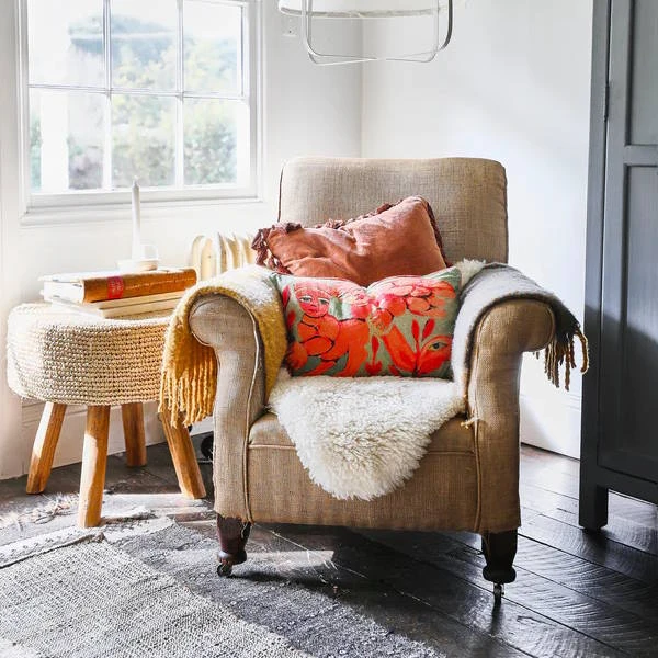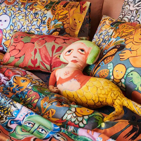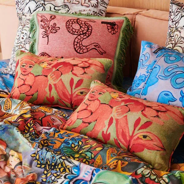 The incredible Kip and Co x Mirka collection is a celebration of beautiful art and one of Australia’s most beloved cultural icons, Mirka Mora. The lovely Pink Angel And Friends Upholstery Cushion features painterly pink angels on a sage green base. The reverse is a plain pale sage green with an orange zip closure. The cushion is a real piece of art and would be stunning by itself, paired with other Mirka pieces, or with another bedding or lounge set as a statement piece.
