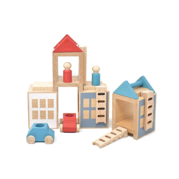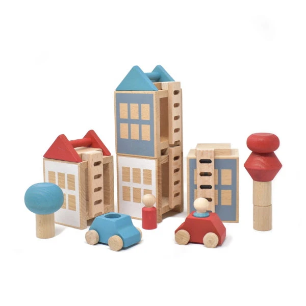 The Lubulona Town Summerville Maxi set includes four stackable houses, four ladders, two toy cars, two peg people, and two roofs, all in stunning red, turquoise, dusty blue grey, white, and natural timber.