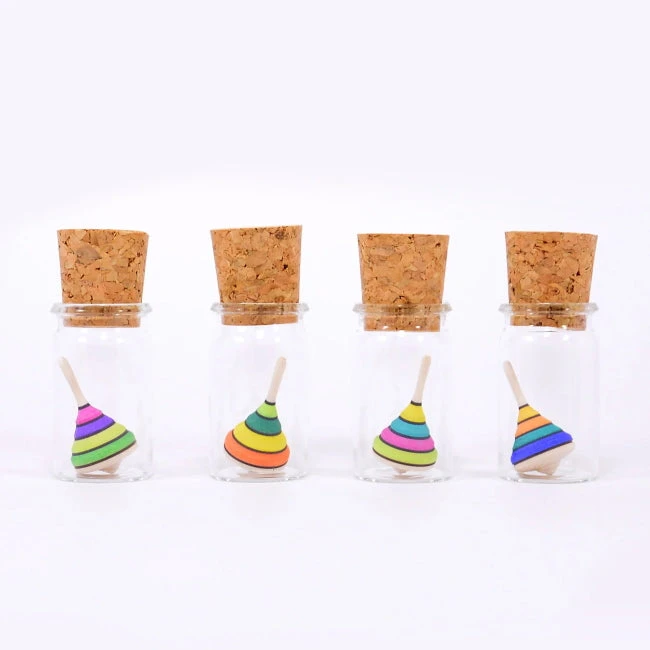 The Mader Miniature Spinning Top Harlekin has been created from a single piece of maple wood. Each Miniature top has four vibrant colours that vary from top to top, yours will be chosen at random. The Harlekin Miniature Spinning Top is an easy-to-spin top, a Level 1 out of 6. It comes in a delicate glass vial for storage.