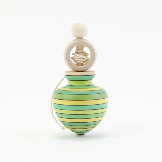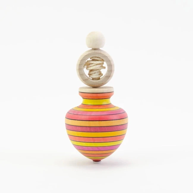 The Mader Ring Spinning Top is an impressively large top with a ring and string-pull starter mechanism. This is a beautifully colourful stripey top that is more challenging and best-suited to more experienced spinners.