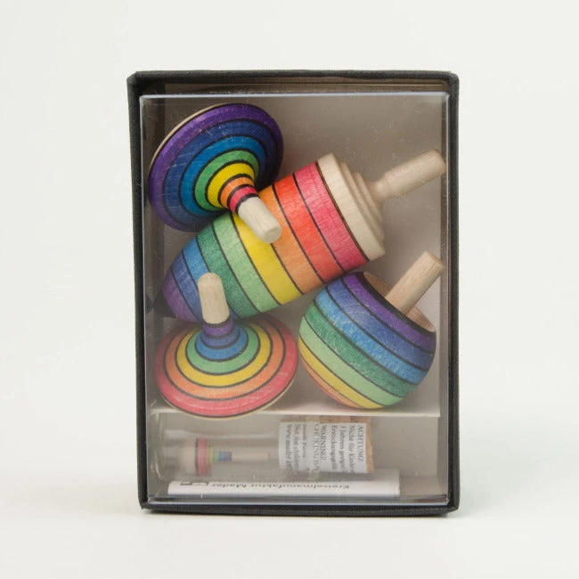 Each Mader Spinning Top from the Learning Set Rainbow has been handpainted in rainbow stripes – some of the tops have red at the top moving to purple at the bottom, some have purple at the top moving to red at the bottom. Your set will be randomly selected.