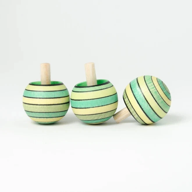 The Mader Spinning Turn Top in Grass Green is handcrafted from a single piece of wood and painted in beautiful green stripes of varying gradients. This listing is for a single Turn Top.