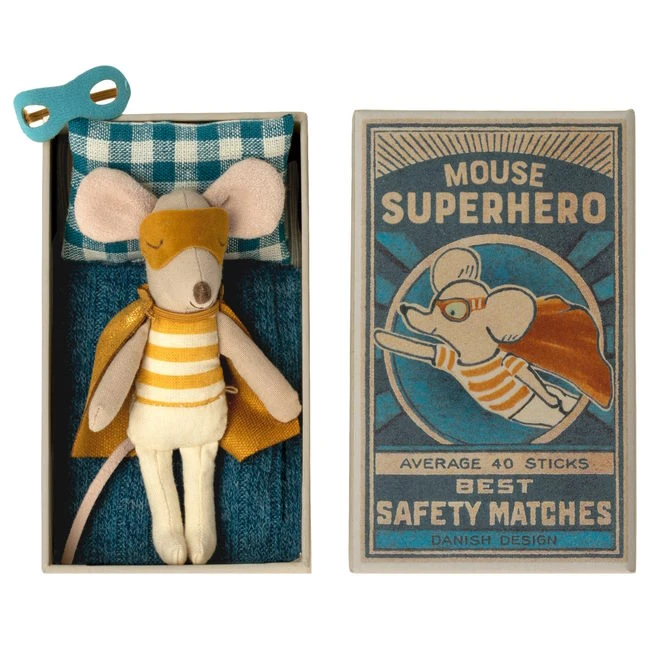 Maileg Mouse Superhero in Matchbox is ready to save the world! Well, that’s when he’s wearing his blue superhero mask. Switch it over to the yellow eye mask and I’m afraid he’s fallen asleep! Our Superhero wears a yellow stripey top, removable yellow cape, and interchangeable eye masks. He sleeps on a pillow, blanket, and mattress in ocean-blue checks and stripes. Our Superhero Mouse is a Little Brother-sized Mouse.