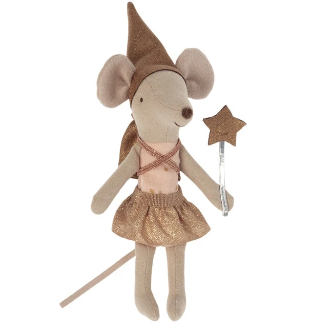 Maileg Mouse Tooth Fairy Rose in Box just loves to flutter around, sprinkling fairy dust and leaving behind shiny gold coins. She wears a magical pointy hat, a little tooth pouch on her back, and a gold tutu skirt, and she holds a golden wand. Your Maileg Tooth Fairy Mouse comes complete with a Maileg My Sweet Tooth metal tin for your child to leave out at night. Our Tooth Fairy Mouse is a Big Sister-sized Maileg Mouse.