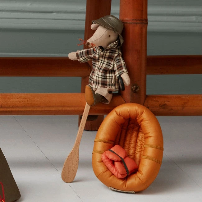 The Maileg Wildlife Guide is a Dad Mouse size. He wears a brown plaid long-sleeved shirt, practical beige pants, and a bucket hat, and he holds a magnifying glass and green sleeping bag in his magnetic hands. His sleeping bag unrolls for night time.