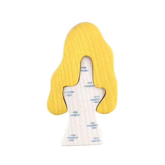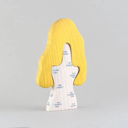 This lovely Autumn Birch Tree has been crafted by Mikheev from ash timber. It comes in two pieces that fit together as a very simple puzzle. The beautiful woodgrain of the timber can be seen through the golden yellow-green of the boughs. The tree trunk has been painted white with soft grey-blue markings to indicate the texture of a birch tree.