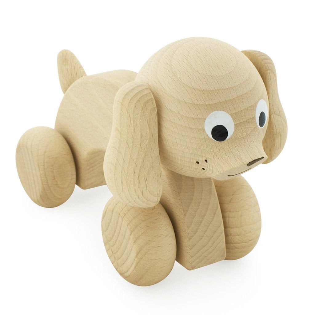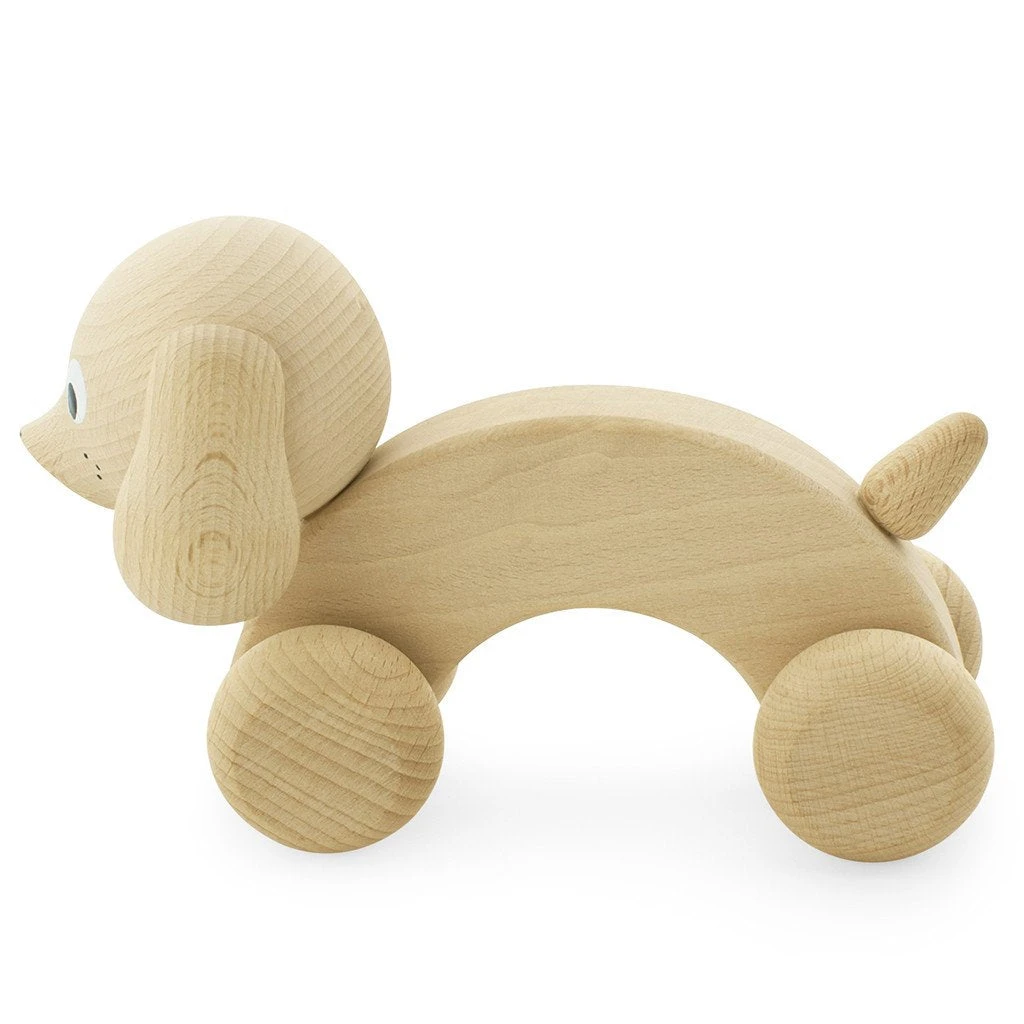 The gorgeous Harley from Miva Vacov is a push along natural timber toy in the shape of a happy little sausage dog with a painted face, lovely long body, floppy ears, and friendly tail. The arch in his back is perfect for little hands to grasp.