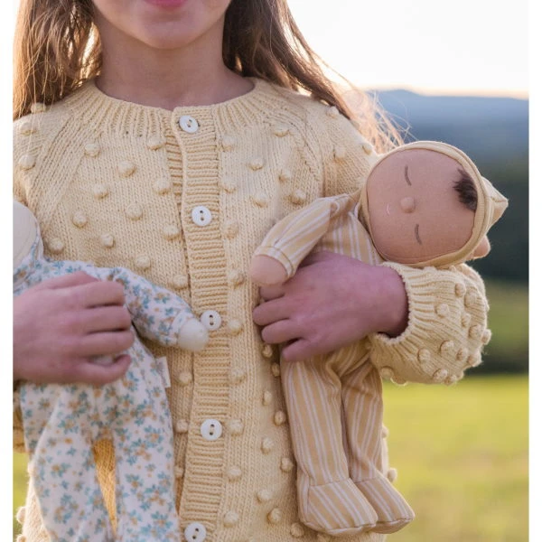 Safe for newborn babies and sure to be adored by pretty much every age, each Olli Ella Dozy Dinkum has a sleepy little embroidered face, comes dressed in a non-removable outfit, and features the sweetest little tuft of hair peeking out of his or her hat. They are the most lovable little cuddly dolls.