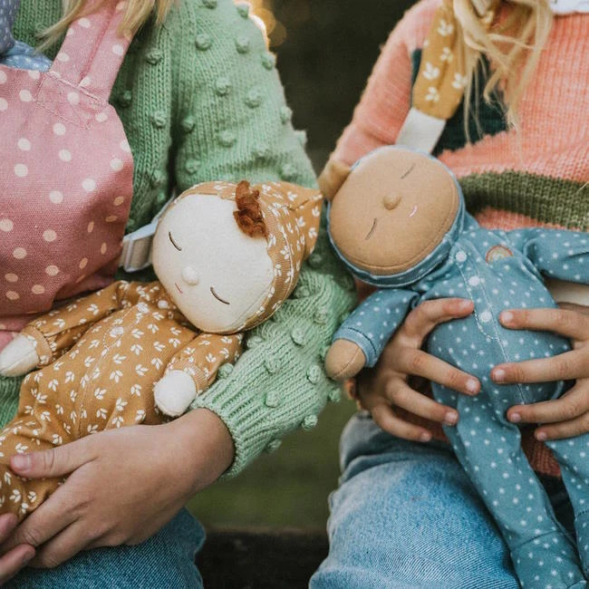 Safe for newborn babies and sure to be adored by pretty much every age, each Olli Ella Dozy Dinkum has a sleepy little embroidered face, comes dressed in a non-removable outfit, and features the sweetest little tuft of hair peeking out of his or her hat. They are the most lovable little cuddly dolls.