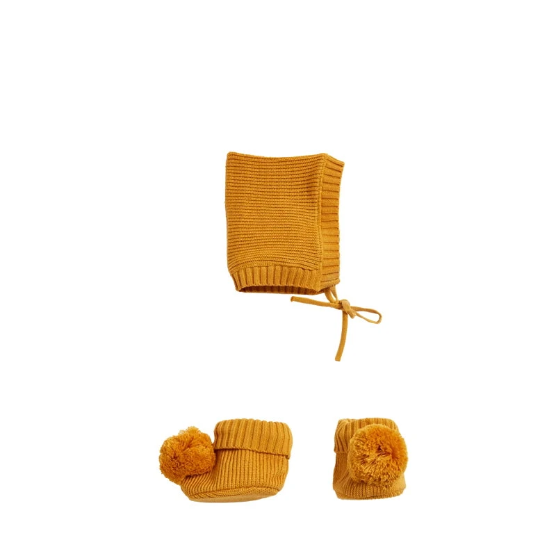 A rich honey mustard accessories set for your favourite Dinkum Doll. The Olli Ella Knit Set in Honey includes a golden yellow pixie hat that ties under the chin and matching cotton knit booties with a fluffy pom pom on each toe.