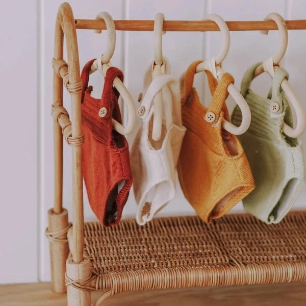 The beautiful Olli Ella Dinkum Doll Rompers are now sold separately – perfect for mixing and matching! The rich Mustard knitted romper is simply gorgeous. It features velcro closures topped with faux buttons, making it easy for little hands to dress and undress their dolly. Made from itch-free knitted acrylic.