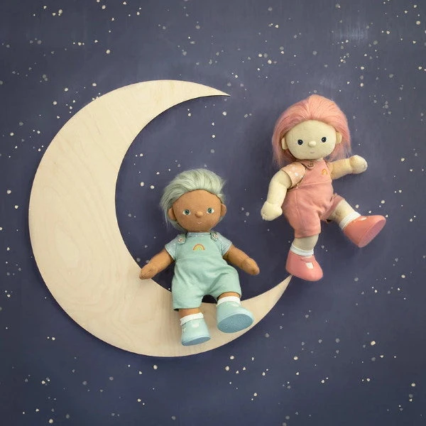 Each Dream Dinkum comes dressed in a soft cotton romper and t-shirt printed with shooting stars, the moon and clouds, and features embroidered details, from their eyes and mouth to the little rainbow right over their heart.