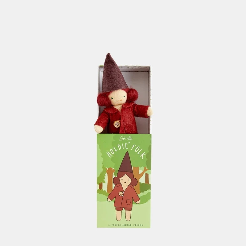 Holly is a great teacher and loves to pass on her gathering knowledge. Nestle her in a pocket and explore the woods together! Handmade, fully posable and measuring 11cm tall (15cm when wearing her pointy hat), she is no bigger than the palm of your hand – the perfect size to pop in a pocket or a teeny bag. Holly’s cotton coat is removable + she can fit into regular Holdie Folk clothing too!