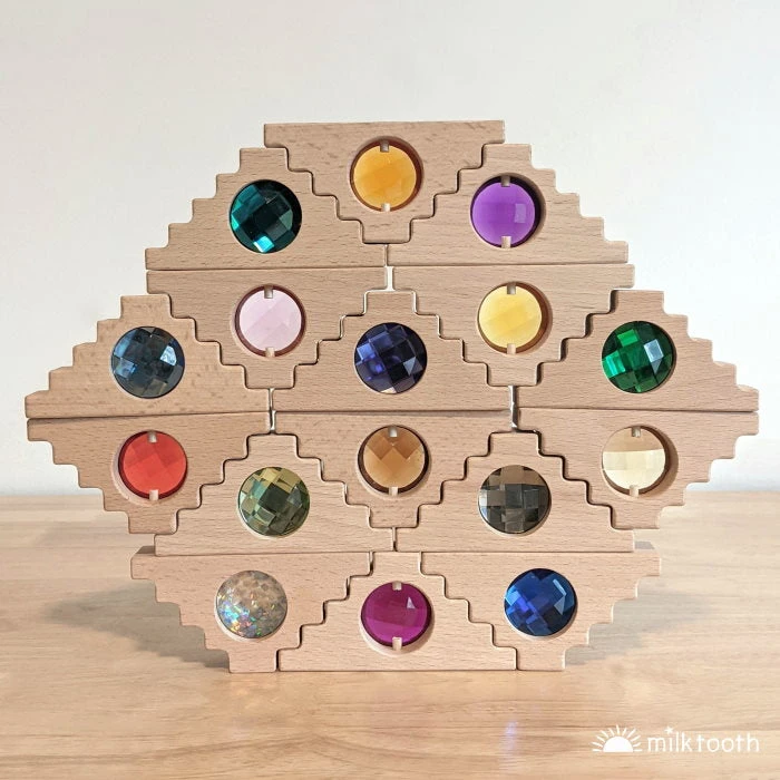 The beautiful architecture of the Netherlands brought to your playroom in the form of these gorgeous Papoose Dutch Step Gable Blocks and Windows. This is a mix pack, with half of the stepped blocks having a sparkly gem set into one side, and half having a see-through window set into and visible from both sides of the block. The gem blocks included are all in cool colours and the windows are in warm colours, creating a beautiful rainbow set.