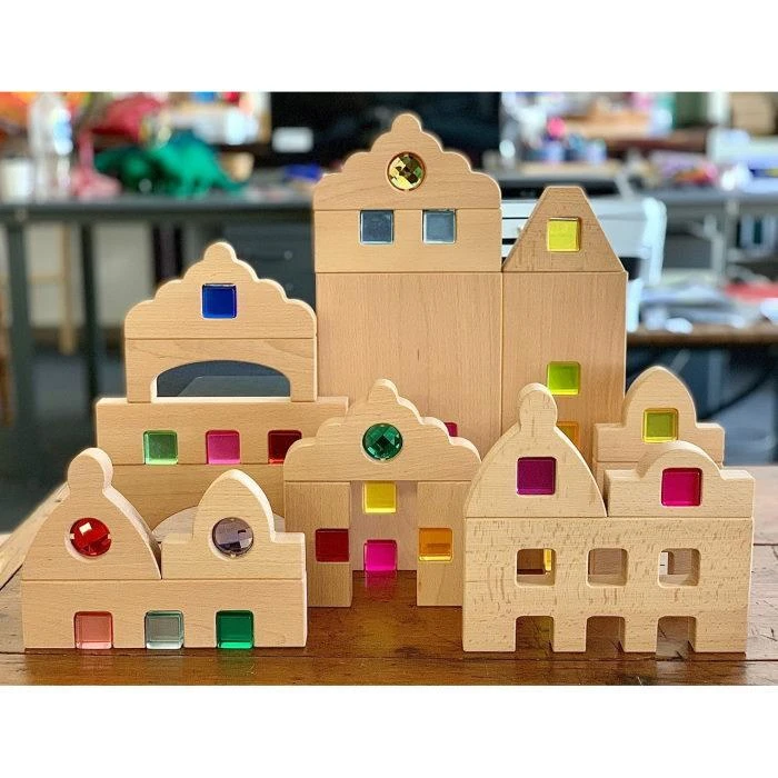 Each window block has a see-through “gem” set into it and visible from both sides of the block. Their transparency invites children to play with light and colour. Play with them at a window or directly in the sunshine to learn about light refraction.