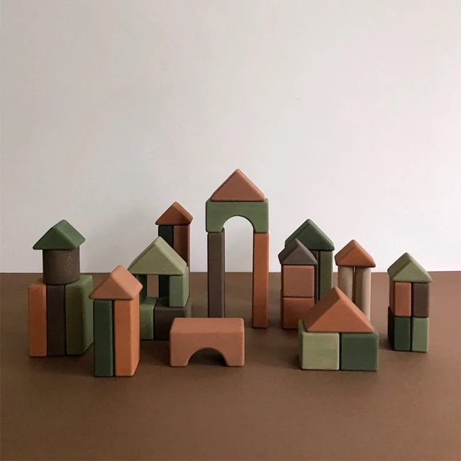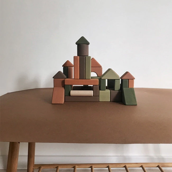 The Olive SABO Concept Castle Blocks have been stained in dark brown, rich chocolate brown, chestnut, olive green, and khaki, with a few blocks left in their natural timber state. They have rounded edges and corners and a beautiful tactile matte feel, meaning they stack and balance easily. The blocks have a base dimension of 4cm, making them compatible with other popular wooden building block brands.