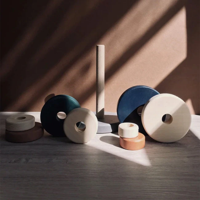 SABO Concept Ring Stackers comprise eight rings of gorgeous linden wood on a timber stand, stained in rich earthy colours. Each ring has rounded edges and a beautiful tactile matte feel.