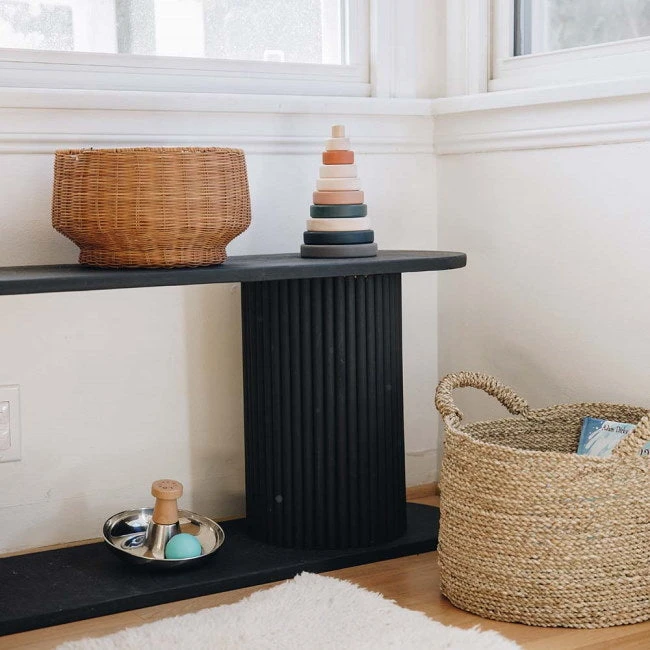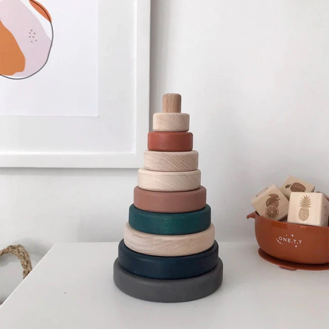 The Terracotta SABO Concept Stacking Tower features earthy tones of deep green, navy/teal, terracotta, fawn, khaki, beige, and milk chocolate. A delightful piece that would look beautiful in any nursery or playroom and is instantly appealing to little hands.